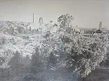 Although its building allotments and street plan still exist,[2][55] what was once the village of Illewong has now disappeared, except for some remains of the old mine workings, slag from smelting operations, the village's cemetery, and a semi-cleared area at the village's former site. In satellite views, it is possible to discern the street shown in the village plan as Meryula Street.[56][2][57][58][59][60] The village was once connected to Cobar via the Cobar-Illewong road, which branched from the Hillston Road (modern-day Kidman Way) just to the north of The Peak mine;[61][62] its former route is barely discernible in satellite views. The old village site and mine ruins are not accessible to the public, because the access road is on private land.