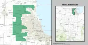 The 14th congressional district of Illinois is currently represented by Democrat Lauren Underwood. It is located in northern Illinois, surrounding the outer northern and western suburbs of Chicago.