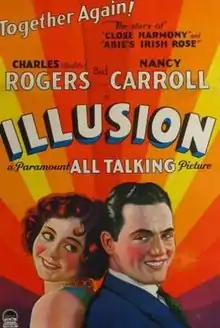 Illusion is a 1929 American Pre-Code drama film directed by Lothar Mendes and written by Richard H. Digges Jr., E. Lloyd Sheldon and Arthur Chesney Train. The film stars Charles "Buddy" Rogers, Nancy Carroll, June Collyer, Kay Francis, Regis Toomey, Knute Erickson and Eugenie Besserer. The film was released on September 21, 1929, by Paramount Pictures.[1][2]