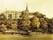 Ilsenburg House (German: Schloss Ilsenburg) stands in the town of Ilsenburg (Harz) in the German state of Saxony-Anhalt and was given its present appearance in the 2nd half of the 19th century. The structure was built from 1860 onwards on the west and north sides of the Romanesque monastery of Ilsenburg Abbey. The stately home, designed in the Neo-Romanesque style, was the seat of the princes of Stolberg-Wernigerode until 1945. Since 2005, it has been owned by the Ilsenburg Abbey Foundation.