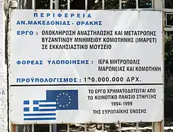 The conversion of the imaret into an ecclesiastical museum took place between 1994 and 1999 with the support of the European Union. The sign placed outside the church-museum reads that it is "a Byzantine monument in Komotini which was converted into a church museum (imaret)". The Association of University Graduates of the Western Thrace Minority published a report on the matter to the Organization for Security and Cooperation in Europe (OSCE) saying that this move was aimed at "changing the identity of the Ottoman monument, and with the help of the European Union at that."[11]
