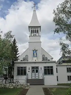 Built in 1904, it was the first Roman Catholic Church erected in Alaska's interior.[4] The church was originally located on Dunkel Street, but in the winter of 1911–12, the church was moved across the Chena River to its present location[5] so that it would be closer to St. Joseph's Hospital, which closed in the 1960s. After the move, the basement of rough frame structure was enlarged to provide a parish hall, it was wired for electricity, and a parish house was built adjacent. The steeple and vestibule were added in 1914, the roof was raised, and the choir gallery added. Its stained glass windows were added in 1926–28.[4]