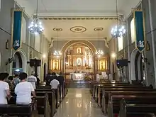The town of Los Baños started as a visita of Bay under the Augustinian order with Nicolas de Tolentino as the titular saint.[1] In 1590, Franciscans replaced the Augustinians in their missions with Pedro Bautista, later canonized as San Pedro Bautista. He discovered numerous hot springs in the area which locals called Maynit.[2] He created a public bath he called the Los Baños.[3] After twenty years, the Franciscans established a temporary convent to administer the hot springs that were popular for healing illnesses. A small hospital chapel was built in 1613 in the absence of a church until 1727 dedicated to the Our Lady of Immaculate Conception, with the title Aguas Santas.[4][5] It was brought down by fire in 1727.[5] A temporary chapel was built out of nipa and cane which was later destroyed again by fire.[4][5] A big stone church was built in 1790 by Domingo Mateo in its present site.[5] The belfry, sacristy and tile roofing were supervised by Manuel Amat in 1851 and the convent in 1852.[4][5] The convent and bell tower were destroyed during the 1863 earthquake but repairs were made during the administration of Manuel Rodriguez and Gilberto Martin in 1880.[5] It was also used in World War II as headquarters for the Japanese forces where it was used as a garrison by the Japanese during World War II.