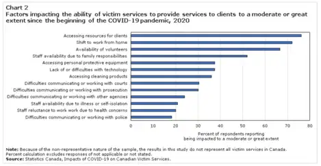- ↑ Government of Canada, Statistics Canada (30 July 2020). "The COVID-19 pandemic and its impacts on Canadian victim services". www150.statcan.gc.ca. Retrieved 30 January 2021.