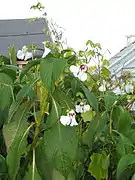 This erect perennial grows from large underground tubers, to a height of 2 m (6.6 ft) or more. It has deeply-veined, elliptic, slightly toothed leaves. Large 6 cm (2.4 in) hooded white flowers, with deep crimson splashes in the centres, hang from short stems in summer and autumn. Each flower bears a curved red spur at the back, up to 5 in (13 cm) long. The flowers are scented like gardenias.[2] The stems and leaves are succulent and fleshy.[2][3]