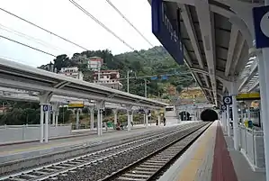 Until 2016, the city of Imperia was served by two separate railway stations, Imperia Porto Maurizio and Imperia Oneglia on the single-track Genoa–Ventimiglia railway.[1] As part of the continuing project to increase capacity, a new double-track line has been constructed to run parallel to the old line along a route further inland.[2] The 18 kilometres (11 mi) section of double-track railway between Andora and San Lorenzo opened in 2016, running largely through tunnels, rather than winding along the coast. The new Imperia station replaced the two old stations, which have been closed.[3][4]