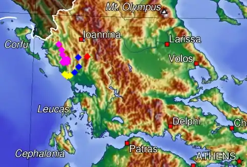 Range: This subspecies occurs in the mountains c. 20 km north of Preveza.[3] The type locality is "Zalongo bei Libochovo",[1] Greece, Ipiros, Preveza: Zalongo, 21 km NNW of Preveza, 200 m and 650–725 m alt.[3]