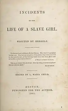 Incidents in the Life of a Slave Girl, written by herself is an autobiography by Harriet Jacobs, a mother and fugitive slave, published in 1861 by L. Maria Child, who edited the book for its author. Jacobs used the pseudonym Linda Brent. The book documents Jacobs's life as a slave and how she gained freedom for herself and for her children. Jacobs contributed to the genre of slave narrative by using the techniques of sentimental novels "to address race and gender issues."[1] She explores the struggles and sexual abuse that female slaves faced as well as their efforts to practice motherhood and protect their children when their children might be sold away.