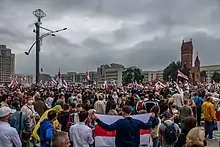 During the 2020 Belarusian protests, the square was an area where many rallies occurred. President Lukashenko addressed supporters of him on the square hours before tens of thousands of opposition protesters began gathering in the same area. Lukashenko told his supporters "to defend your country and its independence".[3] Lukashenko's son Nikolai was compared to a bodyguard due to him wearing a jacket, white shirt and sunglasses.[4] During the protests, many shouted and chanted "Leave!", referring to demands for Lukashenko's resignation.[5]