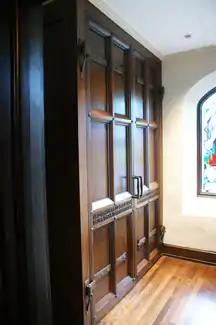 Carved wooden doors in the acolyte vesting room