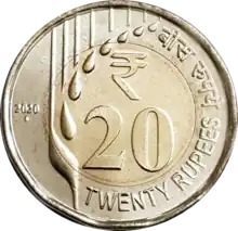 The Indian 20-rupee coin (₹20) is a denomination of the Indian rupee. The ₹20 coin is the highest-denomination circulation coin minted in India since its introduction in 2019. The present ₹20 coin is released for circulation. The release of the coin was supposed to be in March 2020, but it was shifted to May 2020 because of the COVID-19 lockdown. This is used alongside the 20 rupee banknote.[1][2] This coin was released in May 2020 along with the new series of the rupee coins.