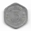 The Indian Three paise (Hindi: तीन पैसे) (singular: Paisa), is a former denomination of the Indian Rupee. The 3 coin equals 3100 of the Indian Rupee. The symbol for paisa is ().