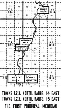 Robert Armstrong was a white man married to a Wyandot woman. The Treaty of Fort Meigs granted him 640 acres on the west side of the Sandusky river.[12] This tract is located in T2N R14E and T2N R15E of the First Principal Meridian.[13]