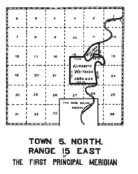 Elizabeth Whitaker was a white woman taken prisoner by the Wyandots who continued to live among them. The Treaty of Fort Meigs granted her 1280 acres on the west side of the Sandusky River around her home downstream from Croghansville.[12] This tract is in T5N R15E of the First Principal Meridian in Sandusky County, Ohio.[13]