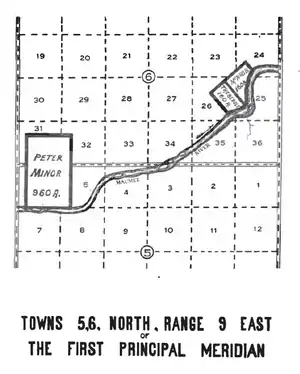 Peter Minor, also known as Yellow Hair or Sawendebans, was adopted son of Tondaganie, or the Dog. He was granted 640 acres by the Treaty of Fort Meigs on the north of the Maumee River at Wolf Rapid.[4] Article XV of the August 30, 1831 Treaty with the Ottawa granted 320 additional acres adjacent to the north to Minor's children.[14] The 960 acres is one survey in T5N R9E and T6N R9E of the First Principal Meridian in Lucas County, Ohio.[15]