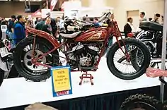 Designed by Charles B. Franklin,[1][3] the Scout was introduced in October 1919 as a 1920 model. The Scout had a sidevalve V-twin engine with its transmission bolted to the engine casing, allowing a geared primary drive - the only American v-twin to use this maintenance-free system.[4] The Scout engine initially displaced 606 cc (37 cu in), but the engine size was increased to 745 cc (45 cu in) in 1927 in response to the popularity of the Excelsior Super X.[1][5] In early 1928, a front brake was added to the Scout.[6]