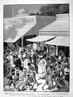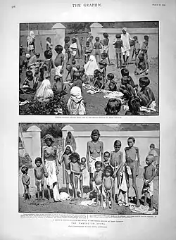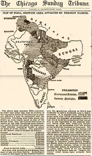 The Indian famine of 1896–1897 was a famine that began in Bundelkhand, India, early in 1896 and spread to many parts of the country, including the United Provinces, the Central Provinces and Berar, Bihar, parts of the Bombay and Madras presidencies, and parts of the Punjab; in addition, the princely states of Rajputana, Central India Agency, and Hyderabad were affected.[1][2] All in all, during the two years, the famine affected an area of 307,000 square miles (800,000 km2) and a population of 69.5 million.[1] Although relief was offered throughout the famine-stricken regions in accordance with the Provisional Famine Code of 1883, the mortality, both from starvation and accompanying epidemics, was very high: approximately one million people are thought to have died.[1]