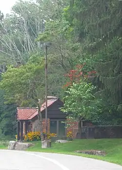 The original guard house at the end of SR 727, at the entrance to Pokagon State Park. This guard house, like many stone structures at Pokagon, was built by the Civilian Conservation Corps.