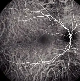 Indocyanine green angiography (ICGA) is a diagnostic procedure used to examine choroidal blood flow and associated pathology. Indocyanine green (ICG) is a water soluble cyanine dye which shows fluorescence in near-infrared (790–805 nm) range, with peak spectral absorption of 800-810 nm in blood.[1][2] The near infrared light used in ICGA penetrates ocular pigments such as melanin and xanthophyll, as well as exudates and thin layers of sub-retinal vessels.[3] Age-related macular degeneration is the third main cause of blindness worldwide, and it is the leading cause of blindness in industrialized countries.[4] Indocyanine green angiography is widely used to study choroidal neovascularization in patients with exudative age-related macular degeneration.[5] In nonexudative AMD, ICGA is used in classification of drusen and associated subretinal deposits.[5]