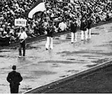 The Indonesian team consisted of three male athletes: high jump athlete Maram Sudarmodjo, swimmer Habib Suharko and weightlifter Thio Ging Hwie.[3] They were selected from participants of the 1948 National Sports Week and the 1951 Asian Games.[4] Maram Sudarmodjo was a former youth fighter in the War of Independence and a future lieutenant colonel in the country's air force.[4] Previously he won a gold medal in the 1948 National Sports Week and a bronze medal in the 1951 Asian Games, both with the best jump of 1.89 m.[5] Thio Ging Hwie was the first ethnic Chinese Indonesian to participate in an international sports event.[6] A non-participant served as a flag-bearer at the opening ceremony.[7] Two officials and one spectator was registered as part of the delegation, and six press passes were issued for the country.[8] With just three athletes, it was one of the smallest teams in 1952, bigger than China, Guyana, Panama (one athlete each) as well as Trinidad & Tobago and Liechtenstein (two each).[3]