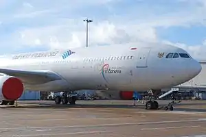 The Indonesian presidential aircraft (Indonesian: Pesawat Kepresidenan Indonesia), also known as Indonesia Air Force Zero One with the serial number A-001 is the presidential aircraft carrying the president and vice president of Indonesia. The aircraft was designed to meet the minimum safety and security standards to support the VVIP air transportation needs of the Indonesian president,[1] and includes a modest self-defense system.[2]
