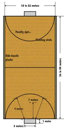 - The pitch is smaller than the outdoor pitch. An indoor pitch is 18m to 22m wide by 36m to 44m long (similar to a handball or futsal pitch), divided by a center line. The shooting circle is a semicircle measured out 9m from each goal post. Side-boards mark the sidelines, helping to keep the ball on the pitch and allowing players to play against it. When the ball goes over the endline, the defensive team will restart play regardless of which team played the ball last. The pitch is made of wood or synthetic material. The board surface facing the playing surface is angled slightly to encourage ball to bounce down not up.