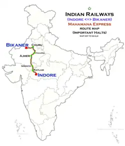 The 19333 / 19334 Indore - Bikaner Mahamana Express is an express train belonging to Western Railway zone that runs between Indore Junction and Bikaner Junction in India.