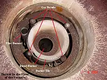 The burner in the vertical, cylindrical furnace as above, is located in the floor and fires upward. Some furnaces have side fired burners, such as in train locomotives. The burner tile is made of high temperature refractory and is where the flame is contained. Air registers located below the burner and at the outlet of the air blower are devices with movable flaps or vanes that control the shape and pattern of the flame, whether it spreads out or even swirls around. Flames should not spread out too much, as this will cause flame impingement. Air registers can be classified as primary, secondary and if applicable, tertiary, depending on when their air is introduced.