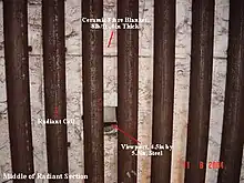 The tubes, shown below, which are reddish brown from corrosion, are carbon steel tubes and run the height of the radiant section. The tubes are a distance away from the insulation so radiation can be reflected to the back of the tubes to maintain a uniform tube wall temperature. Tube guides at the top, middle and bottom hold the tubes in place.