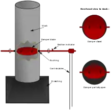 The stack damper contained within works like a butterfly valve and regulates draft (pressure difference between air intake and air exit) in the furnace, which is what pulls the flue gas through the convection section. The stack damper also regulates the heat lost through the stack. As the damper closes, the amount of heat escaping the furnace through the stack decreases, but the pressure or draft in the furnace increases which poses risks to those working around it if there are air leakages in the furnace, the flames can then escape out of the firebox or even explode if the pressure is too great.