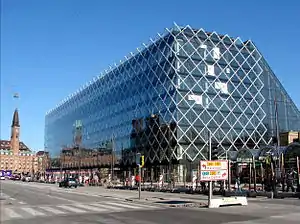 The old building gradually became more and more outdated and it was therefore decided to replace it with a new one. An architectural competition was won by Arne Jacobsen in 1965 but his proposal was met with fierce opposition and was never realized.[3] After Jacobsen's death in 1971, Jørgen Buschardt was charged with the task of designing the building, first alone and later in association with Erik Møller, but their proposal was not realized either. In the end, a third proposal, created by Erik Møller alone, was finally approved. The old building was demolished in 1977 and the new one completed in 1979. The ground floor contained a shopping arcade, Rådhusarkaden ("The City Hall Arcade"). A glass pyramid was constructed in the central courtyard. It was used for exhibitions, conferences and concerts.