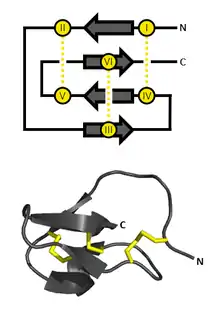 An inhibitor cystine knot (also known as ICK or Knottin) is a protein structural motif containing three disulfide bridges. Knottins are one of three folds in the cystine knot motif; the other closely related knots are the growth factor cystine knot (GFCK) and the cyclic cystine knot (CCK; cyclotide).[2] Types include a) cyclic mobius, b) cyclic bracelet, c) acyclic inhibitor knottins.[3] Cystine knot motifs are found frequently in nature in a plethora of plants, animals, and fungi and serve diverse functions from appetite suppression to anti-fungal activity.[4]