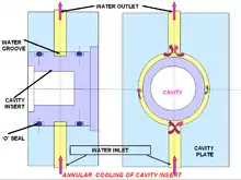 - Annular cooling of cavity insert—A circular groove is made on the core for water circulation. To prevent leakage, O-rings are used above and below the cooling channel.