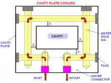 - Cavity plate cooling by drilled holes—The cavity plate is drilled around the cavity insert and plugged with copper or aluminum taper plugs at the ends of openings. Using pipe connected at the inlet and outlet ports, water is circulated to cool the mold.