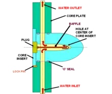 - Direct cooling of core insert (baffle system)—The core is drilled by keeping sufficient wall thickness. A baffle plate is located between the drilled hole, dividing the hole into two halves, allowing the water to contact the maximum area in core so cooling may take place.