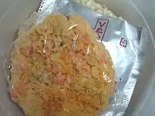 Although uncommon compared to most applications, sometimes a seasoning solution is sprayed directly onto ramen noodles to enhance their flavor, prior to being packaged.[5] Flavor ingredients used in instant ramen noodle soup include dried vegetables and meats, salt, MSG, onion, garlic, yeast extract, hydrolyzed vegetable protein, essential oil extracts and natural or synthetic flavor compounds.[5] Essential oils derived from onion, garlic and clove are sometimes used as flavorings for instant ramen soup, and may be manufactured using expeller pressing or solvent extraction and distillation.[5] Sophisticated methods exist that create flavor compounds, or complex flavors, for the flavoring of instant ramen noodle soups, in which volatile compounds from substances are isolated and reconstituted to create seasoning blends.[5] Techniques to create flavor compounds for instant ramen soups include gas chromatography utilized with mass spectrometry and olfactometry.[5] Ramen noodle soup seasoning packets may also contain anticaking agents and flow agents to prevent the product from clumping into a solid mass.[5]