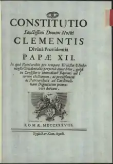 Inter praecipuas apostolici ministerii (Latin pronunciation: [ˈin.ter preˈt͡ʃi.pu.as a.posˈto.li.t͡ʃi mi.nisˈte.ri.i]) was a papal bull issued by Pope Clement XII, on 17 December 1737, establishing that whoever was appointed Patriarch of Lisbon was to be elevated to the rank of cardinal in the next consistory.[1] Lisbon remains the only episcopal see accorded this distinction. Until now, all Popes honored this commitment. Others like the Patriarch of Venice used to be made cardinals in the consistory following their appointment, but only by tradition.