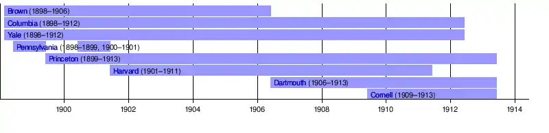 In 1911, restrictions imposed by Harvard faculty forced the college to resign from the league.[5] The following year, both Columbia and Yale left, dropping membership back to just three teams.[6] The league continued until the end of the year before disbanding.