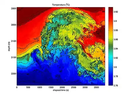 Internal wave breaking is a process during which internal gravity waves attain a large amplitude compared to their length scale, become nonlinearly unstable and finally break. This process is accompanied by turbulent dissipation and mixing. As internal gravity waves carry energy and momentum from the environment of their inception, breaking and subsequent turbulent mixing affects the fluid characteristics in locations of breaking. Consequently, internal wave breaking influences even the large scale flows and composition in both the ocean and the atmosphere. In the atmosphere, momentum deposition by internal wave breaking plays a key role in atmospheric phenomena such as the Quasi-Biennial Oscillation and the Brewer-Dobson Circulation.[2] In the deep ocean, mixing induced by internal wave breaking is an important driver of the meridional overturning circulation.[3] On smaller scales, breaking-induced mixing is important for sediment transport and for nutrient supply to the photic zone.[4] Most breaking of oceanic internal waves occurs in continental shelves, well below the ocean surface, which makes it a difficult phenomenon to observe.
