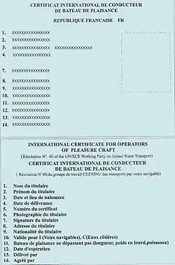 - ↑ "International Certificate (International Card) Concerning the Competence of Pleasure Craft Operators - Resolution No. 14, revised" (PDF). Compendium of resolutions of the Principal Working Party on Inland Water Transport, TRANS/SC.3/131. United Nations Economic Commission for Europe, Inland Transport Committee, Working Party on Inland Water Transport. 29 January 1979. p. 27. Retrieved 2013-11-29.