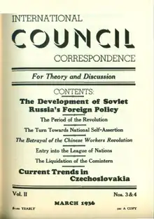 The International Council Correspondence was a council communist magazine published in Chicago from 1934 to 1943. In 1938, it changed its name to Living Marxism and again to New Essays in 1942.[1]