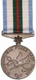 The International Force East Timor (INTERFET) Medal recognises members of the Australian Defence Force who served for 30 days (or 30 sorties) in East Timor during the INTERFET campaign (16 September 1999 – 10 April 2000). The qualifying area comprises East Timor and the sea adjacent to East Timor out to a distance of 12 nautical miles (22 km) from the low water mark.[2]