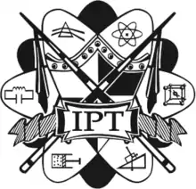 The first logo of the International Physicists' Tournament consisted of a collage representing the different fields of physics. The general outline represent electron orbits around a coat of arms. Six symbols placed in the orbit lobs represents (clockwise) Atomic physics, Crystallography, Classical mechanics, Thermodynamics, Electromagnetism and Optics. Two wands crossing over the arm of coats symbolises the confrontation during the Physics Fights. Finally, a ribbon is laid across the logo with the letters IPT imprinted in the middle.