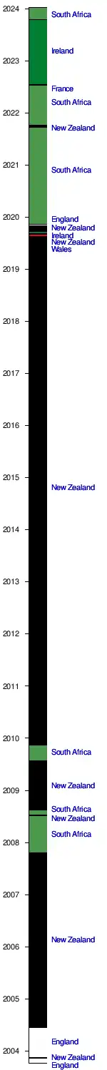 England were ranked as No. 1 when the rankings were introduced in late 2003. New Zealand hold the record for the longest run as the No. 1 World Ranked team, spending just less than three months short of 10 years uninterrupted atop the rankings. South Africa currently top the world rankings. Not shown on the table, but the other nations to have been ranked No. 1, are Wales, spending two weeks in the top spot in 2019, before relinquishing the No. 1 spot to New Zealand, and France who held No. 1 for a week in 2022. Tenures are correct as of the last ranking update on 16 October 2023: