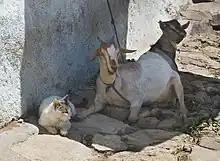 Dogs (Canis lupus familaris) and cats (Felis catus) that coexist in close quarters are two unrelated species that often display companionship towards each other.[1][17] Many coexisting dogs and cats exhibit friendly relationships involving behaviours such as playing and sleeping together, grooming each other and understanding differences in body language and communication.[17] Dogs and cats often engage in mutual nose sniffing which is a form of greeting displayed in cats that is not normally observed in dogs. Dogs may acquire this behaviour from the understanding of cat communication signals.[17]