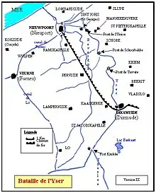 The Battle of the Yser took place in October 1914 along a 35 km (22 mi) long stretch of the Yser river and Yperlee canal in Belgium.[44] On 15 October c.50,000 Belgian troops ended their retreat from Antwerp and took post between Nieuwpoort and French Fusiliers Marins at Diksmuide, which marked the end of the "Race to the Sea". Both sides conducted offensives and when the attacks by the Tenth Army and the BEF to Lille was defeated in early October, more French troops were sent to the north and formed the Détachement d'Armée de Belgique ("Army Detachment of Belgium") under the command of General Victor d'Urbal.[45] Falkenhayn assembled a new 4th Army from the III Reserve Corps, available since the fall of Antwerp and four new reserve corps, which had been raised in Germany in August and were deficient in training, weapons, equipment and leadership. The 4th Army offensive along the coast to St. Omer, began with operations against the Belgians, to drive them back from the Yser.[46]