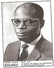 An anti-colonial Pan-African and nationalist movement developed in the Belgian Congo during the 1950s, primarily among the évolué class (the urbanised black bourgeoisie). The movement was divided into a number of parties and groups which were broadly divided on ethnic and geographical lines and opposed to one another.[5] The largest, the Mouvement National Congolais (MNC), was a united front organisation dedicated to achieving independence "within a reasonable" time.[6] It was created around a charter which was signed by, among others, Patrice Lumumba, Cyrille Adoula and Joseph Ileo.[7] Lumumba became a leading figure and by the end of 1959, the party claimed to have 58,000 members.[8] However, many found the MNC was too moderate. A number of other parties emerged, distinguished by their radicalism, support for federalism or centralism and affiliation to certain ethnic groupings. The MNC's main rival was the Alliance des Bakongo (ABAKO) led by Joseph Kasa-Vubu, a more radical party supported among the Kongo people in the north, and Moise Tshombe's Confédération des Associations Tribales du Katanga (CONAKAT), a strongly federalist party in the southern Katanga Province.[9]