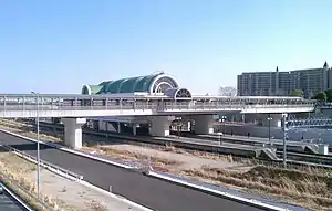 This station consists of two ground-level island platforms serving four tracks, with an elevated station building located above to one side.
