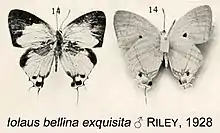 - Iolaus bellina exquisita (Riley, 1928) (southern Cameroon, Gabon, Congo, Democratic Republic of the Congo, Uganda, western Kenya, north-western Tanzania)