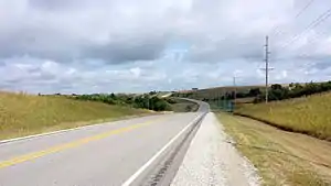 North of the quadripoint, Iowa 25 runs along the Adams–Union county line. It crosses the Platte River south of the unincorporated community of Kent. North of Kent, the highway meets U.S. Highway 34 (US 34) and the two routes head east together towards Creston. Shortly after crossing into Union County, the two routes turn to the northeast. In southern Creston, the two routes split with US 34 continuing to the east and Iowa 25 heading north along Sumner Street through the western part of town. Near Southwestern Community College, the route turns to the west along Townline Road.[4] It crosses Summit Lake, a reservoir created by damming the Platte River. West of Summit Lake, the highway turns 90 degrees to the north and passes close to Green Valley State Park.[3]